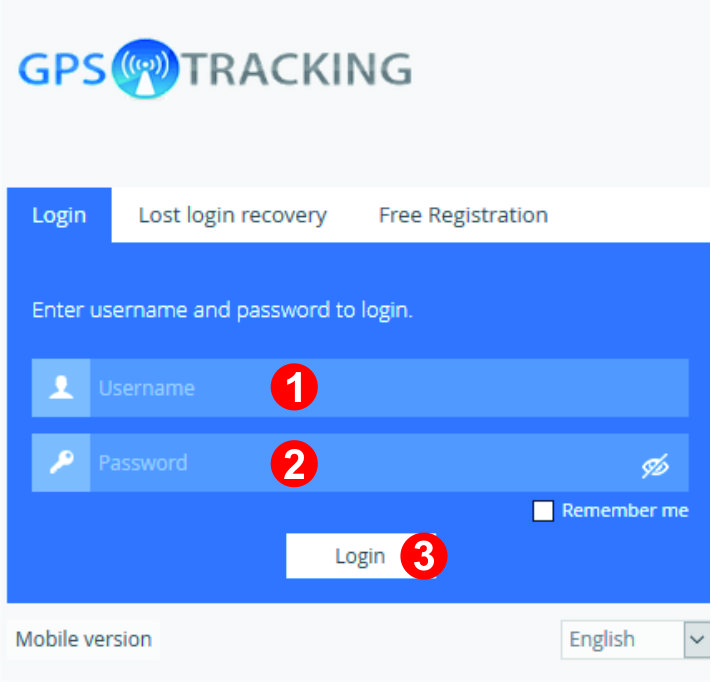 Terdapat 2(dua) kolom yang wajib diisi dengan benar pada halaman login/akses server Pelacakan.Net yaitu username/nama pengguna(1) dan password/kata sandi(2), silahkan masukan data akses Anda setelah itu tekan Enter atau klik tombol login(3)